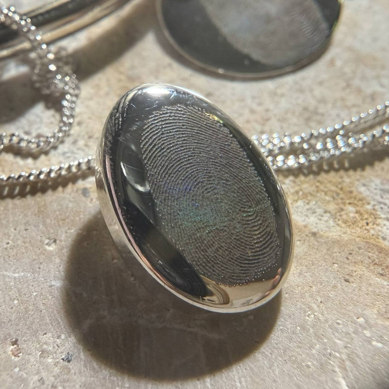 Timeless, refined, and uniquely yours – this Oval Pendant Necklace is crafted from high-quality 925 sterling silver, known for its brilliance and lasting strength. With softly rounded edges and a sleek, polished finish, this piece offers a modern yet sentimental touch. The front side of the pendant can be custom engraved with your loved ones fingerprint, transforming it into a deeply personal keepsake or thoughtful gift. Whether worn every day or saved for special moments, this elegant design keeps love, memory, and meaning close to your heart – all while adding a subtle statement to your style.